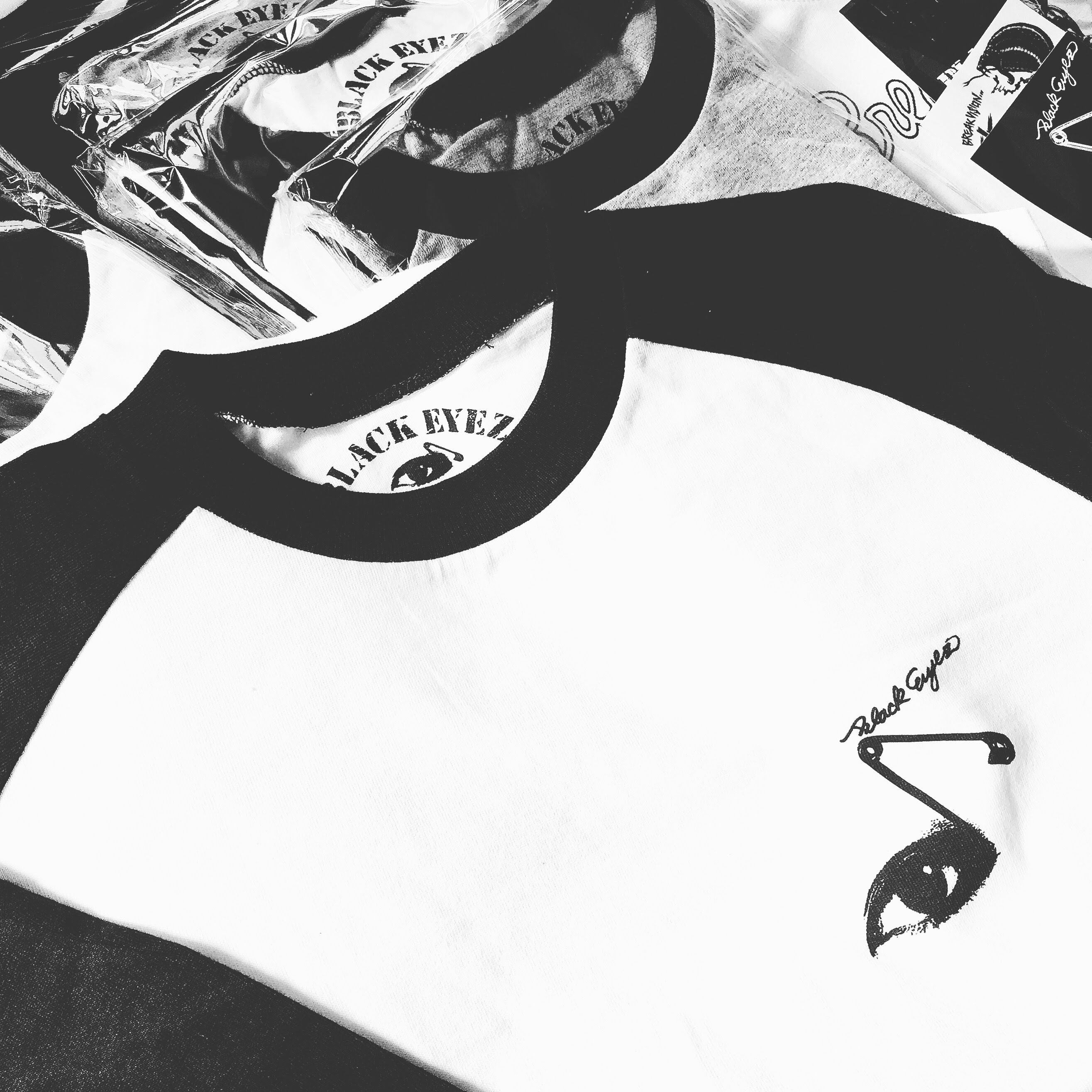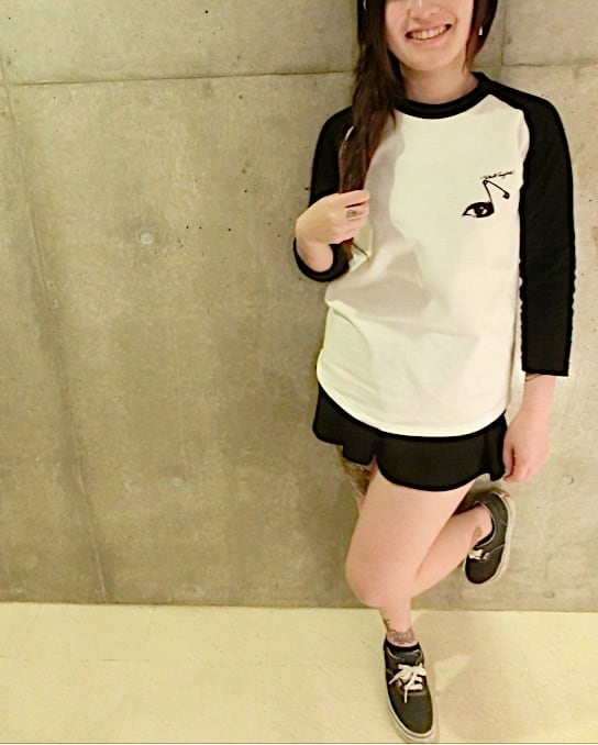 瞳に安全ピンで音符に仕上げたロゴのワンポイント。