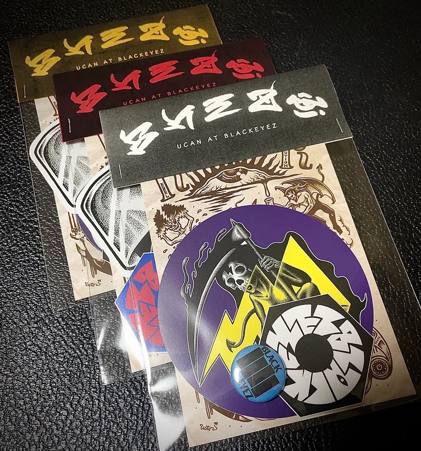 ポストカード1種、ステッカー大小合わせて4種、缶バッチ2種をパッケージにしたセット商品化です。 ステッカー小と缶バッジはランダムになりますのでご了承下さい。
